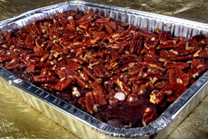 3. Pour cake mix into a mixing bowl. Slowly add warm pudding, stirring constantly with a wooden spoon to prevent clumping. Batter will be sticky. Spread into the prepared cake pan. Sprinkle chocolate chips over batter, then sprinkle on pecan halves.