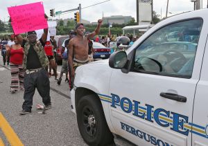 At Ferguson Avenue and West Florissant Road, about 150 demonstrators also blocked traffic. They were taunting police officers, who were lined up in riot gear, carrying shields and batons.