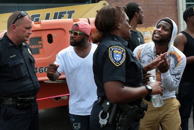 “It could have been one of your kids,” yelled Charles Staton, 35, of Ferguson, at the officers. “Protect and serve. They aren’t protecting.”