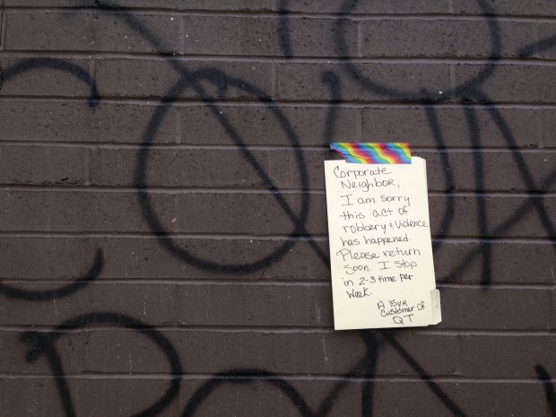 "Corporate neighbor: I am sorry this act of robbery and violence has happened. Please return soon."