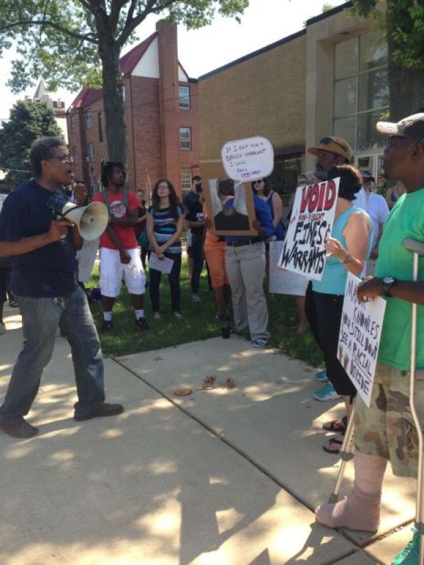 “No one should have to make a choice between taking care of their children and making a court appearance for some nonviolent crime,” Derek Laney, of Missourians Organizing for Reform and Empowerment, shouted through a bullhorn.