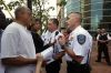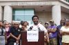 Because this is the day the grand jury will hear evidence in the Brown case, nearly a dozen Clayton police officers were standing outside the Justice Center where about 40 protesters had gathered by 10 a.m. Police riot gear is going unused, left on the floor of the main lobby. Reporters easily outnumbered the protesters.